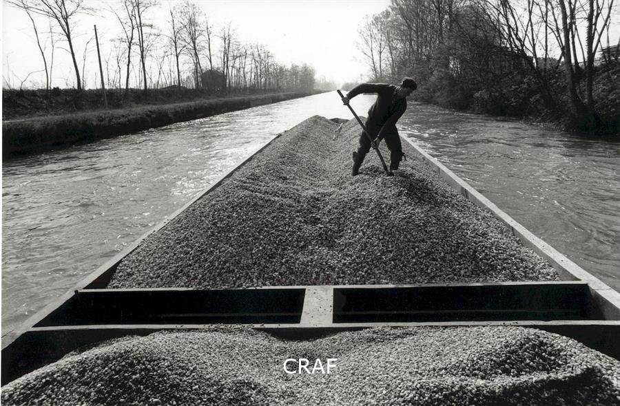 Un uomo scende lungo il Naviglio su un barcone pieno di ghiaia