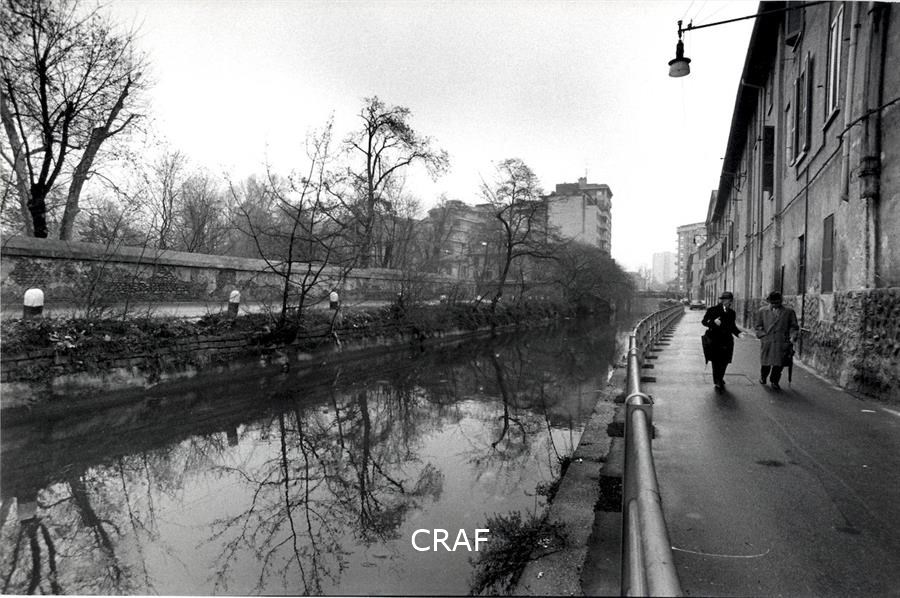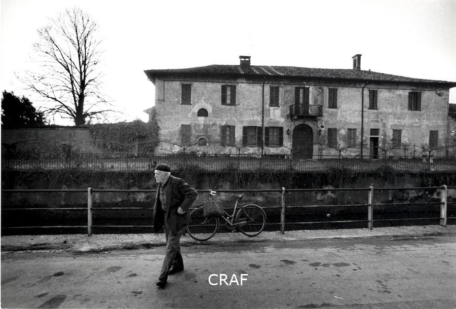 Un anziano cammina verso sinistra lungo il Naviglio Pavese