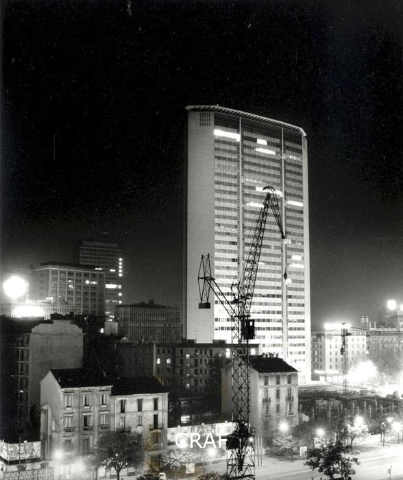 Una gru in primo piano, sullo sfondo il Grattacielo Pirelli tra le vecchie case...