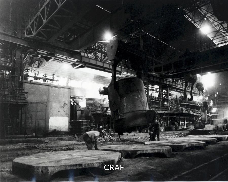 Veduta dell'interno dell'acciaieria con due operai al lavoro in primo piano