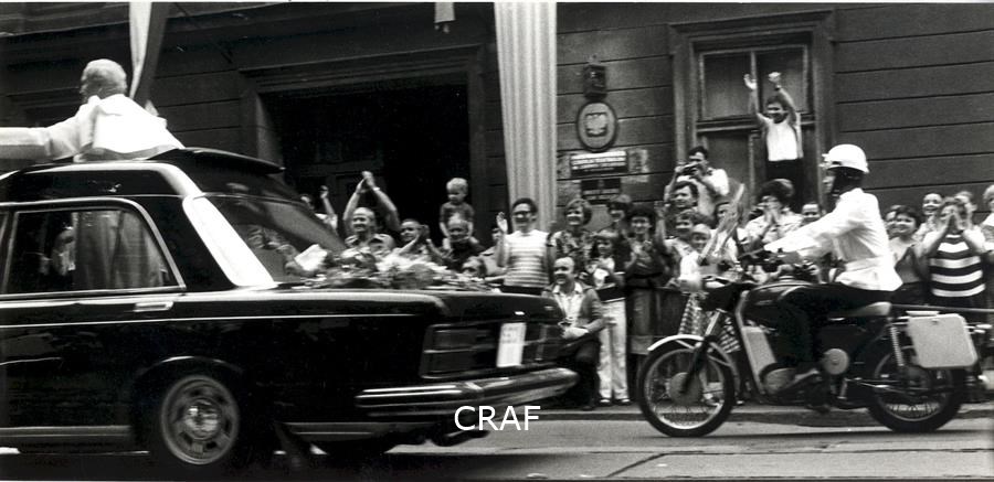 Il Papa attraversa la città di Cracovia in automobile circondato dalla...