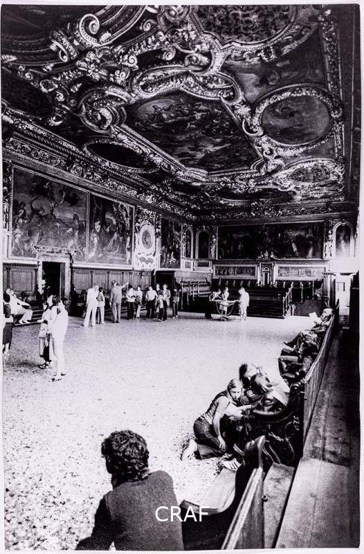 Visitatori nella sala del Senato in palazzo Ducale. Didascalia riportata sotto...