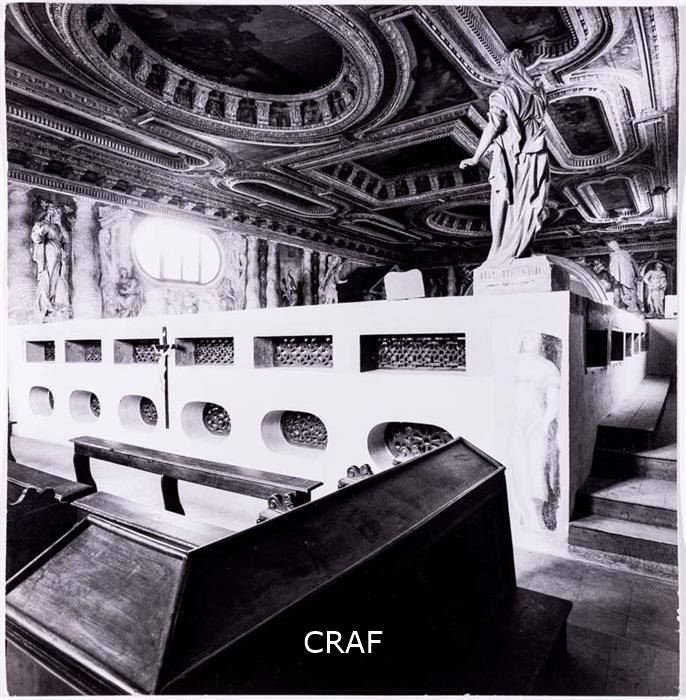 Il soffitto con le tele del Veronese e le statue in stucco del Campagna del barco (coro) delle monache a S. Sebastiano.