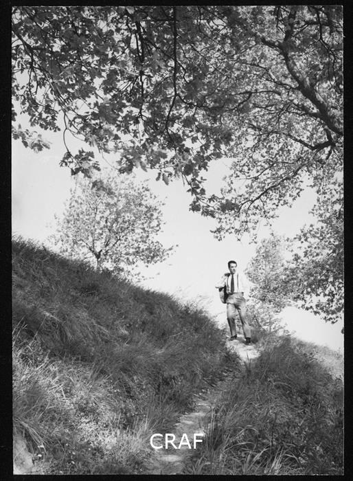 Un uomo in abito elegante scende lungo un sentiero. Immagine appartenente agli...