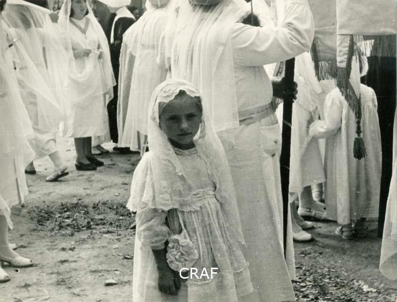 Ritratto di una bambina con indosso una tunica e un velo da comunione