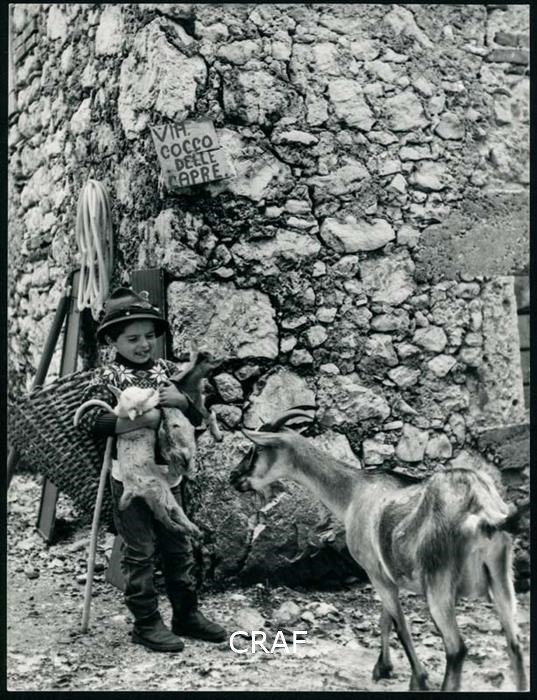 Un bambino ritratto sorridente tiene in braccio due caprette mentre una capra...