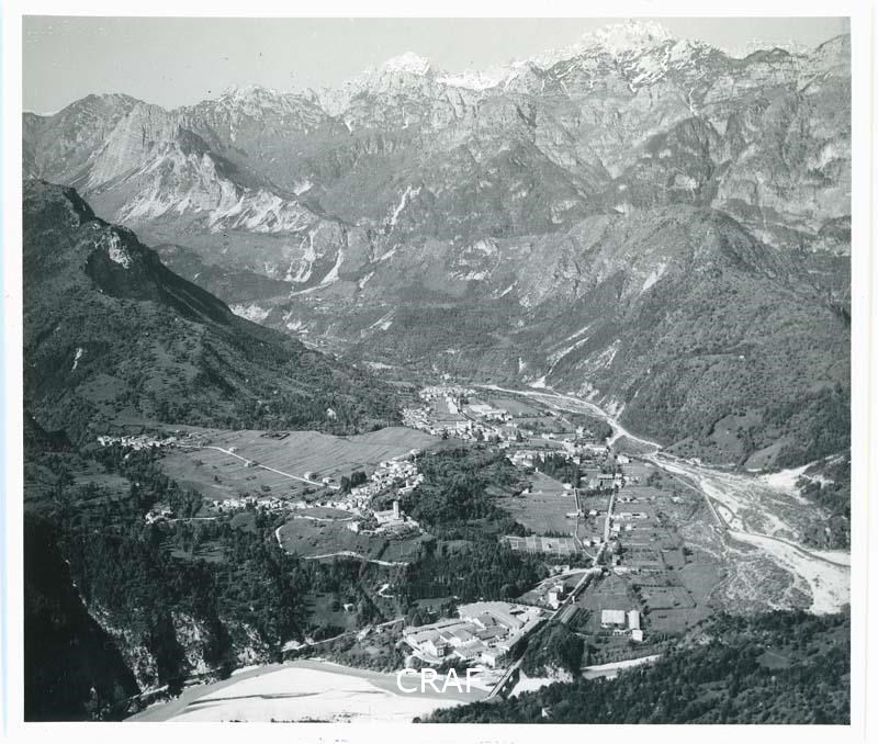 Veduta di Moggio ripresa in quota con il fiume Fella in primo piano e la Val...