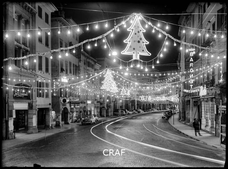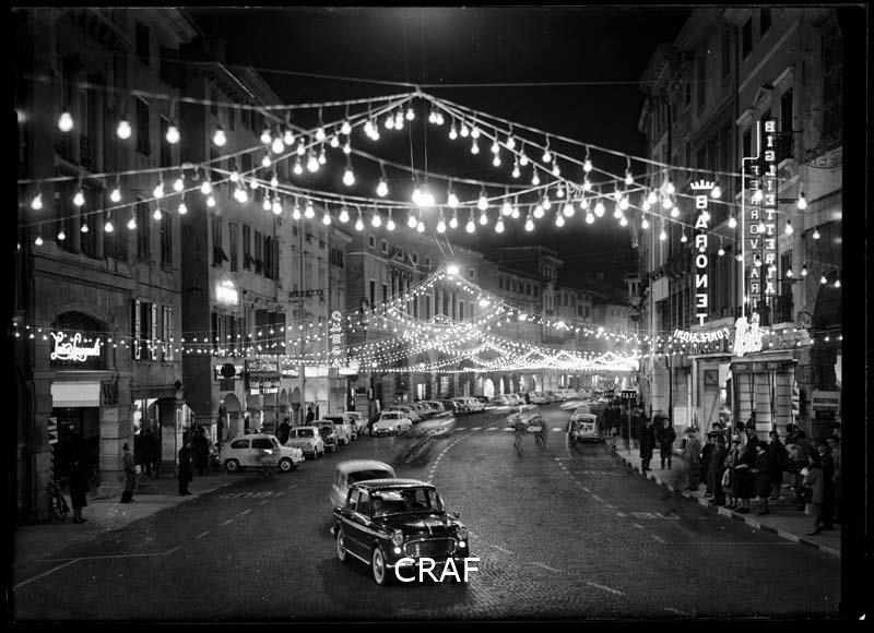 Notturno con addobbi natalizi in via Mercatovecchio inquadrata dal lato nord...
