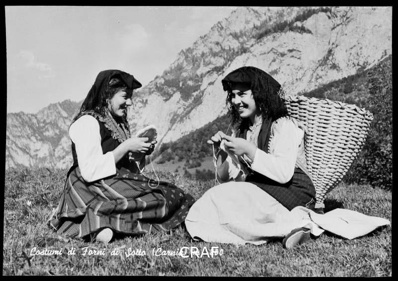 Riproduzione di un ritratto di due ragazze che posano in abiti carnici, sedute...