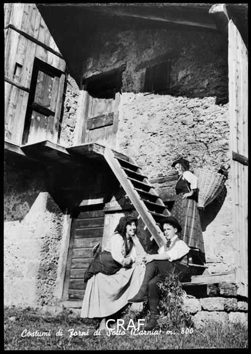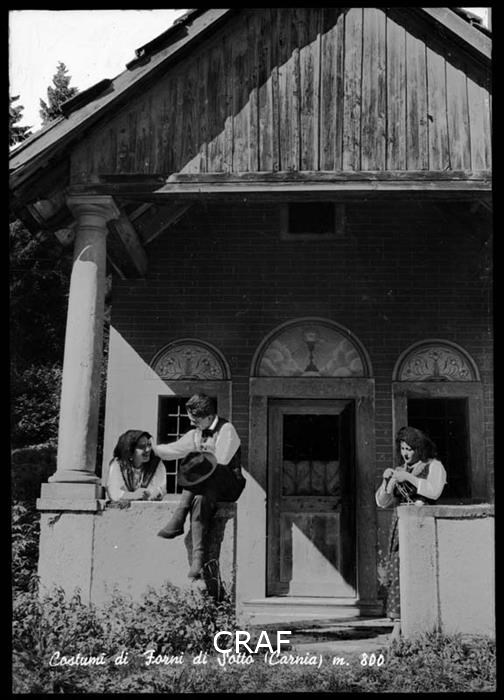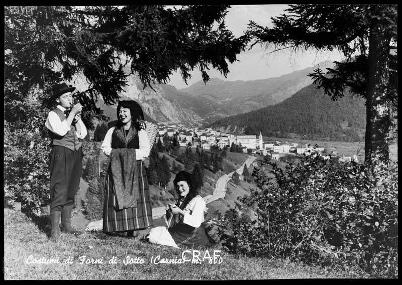Riproduzione di una veduta di Forni di Sopra con in primo piano un gruppo di...