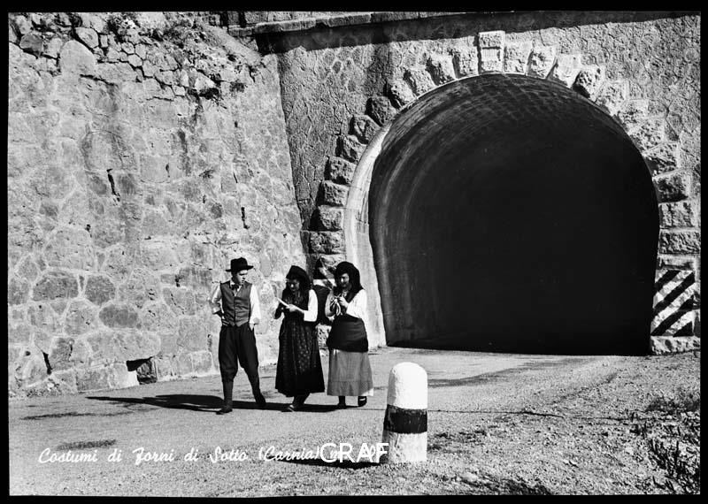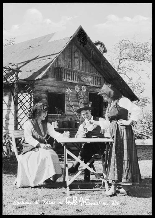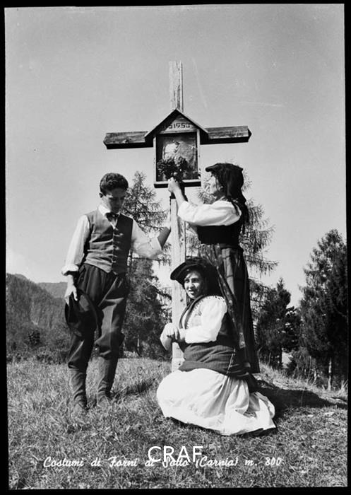 Riproduzione di un ritratto di tre giovani in abiti carnici che passeggiano...