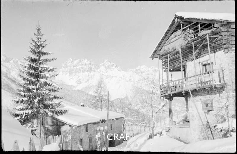 Fotografia invernale di uno stavolo con il tipico fienile sulla facciata; sullo...