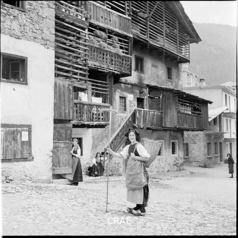 Ritratto di una donna in abiti tradizionali e con la gerla che posa danti ad...