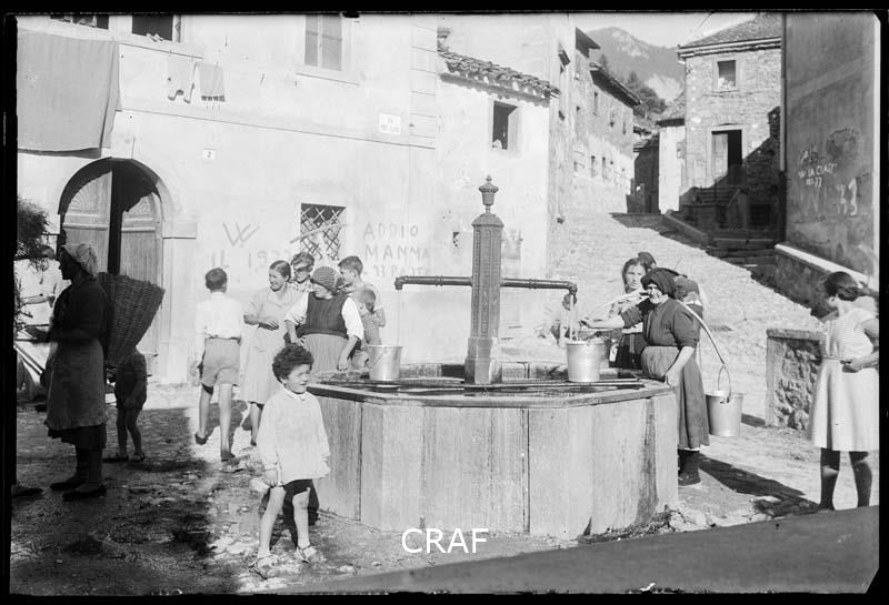 Immagine della fontana del paese frequentata da numerosi bambini e donne che...