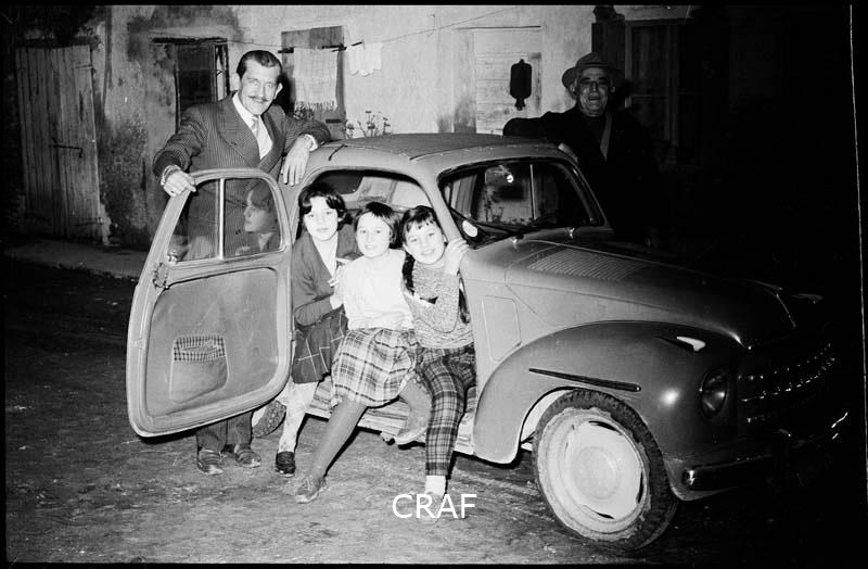 Ritratto in notturna su di una Fiat 500 Topolino: tre bambini seduti...