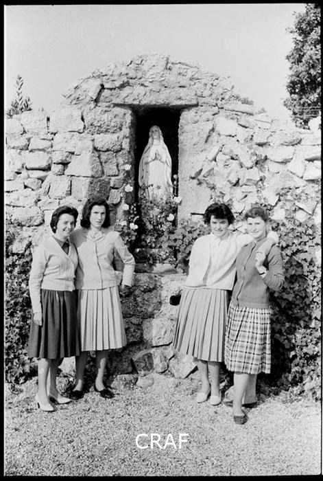 Ritratto di Anna Quarin assieme a tre amiche in posa accanto alla grotta votiva...