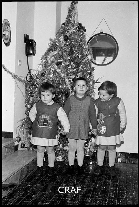 Ritratto di tre bambine in posa davanti all'albero di Natale, ognuna con un'...