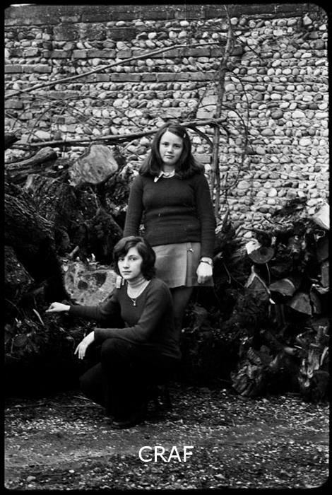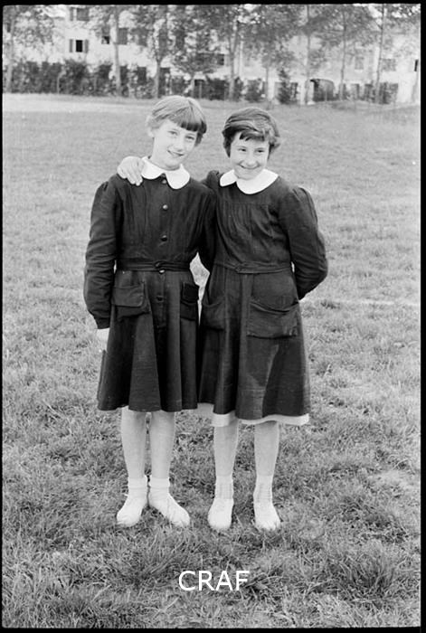 Ritratto Bellini Vanda e Sartori Franca con divisa scolastica nei giardini...