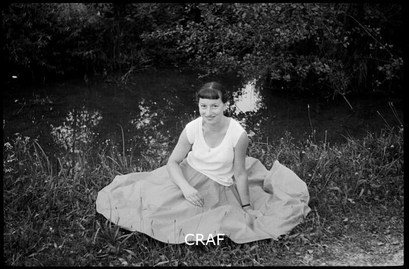 Ritratto di Antonietta Sigalotti seduta sul prato accanto ad un piccolo laghetto