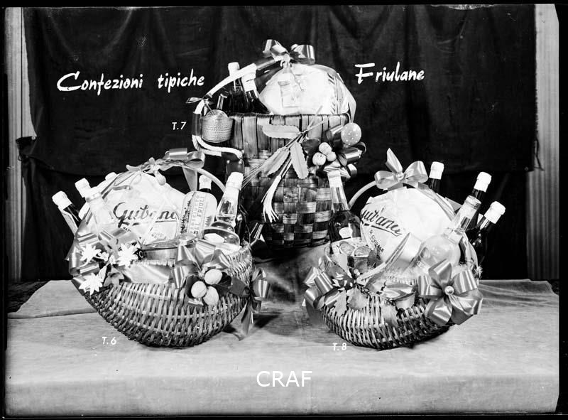 Composizione natalizia di prodotti tipici, gubane e bottiglie di vino, esposti...