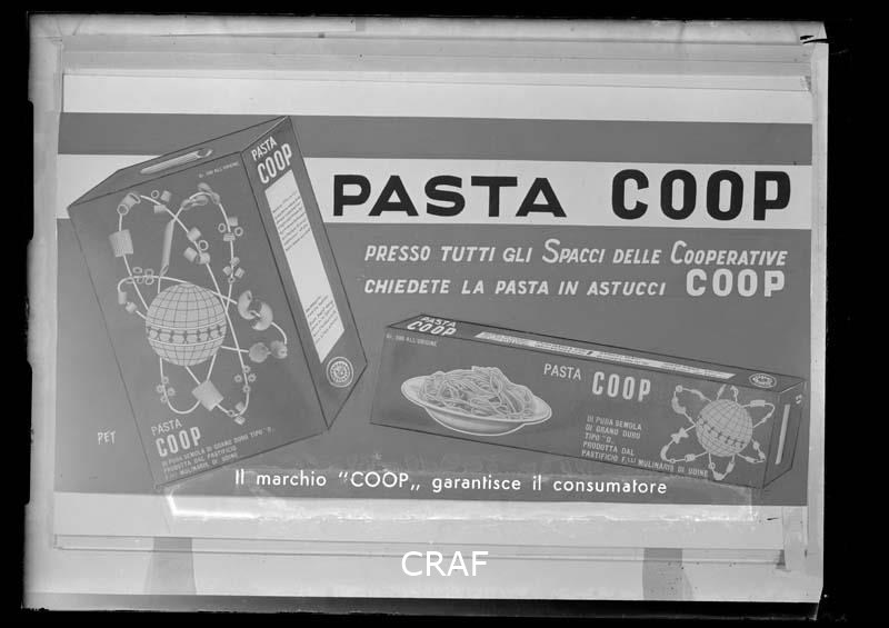 Cartolina pubblicitaria per la Pasta COOP che raffigura una scatola di pasta...