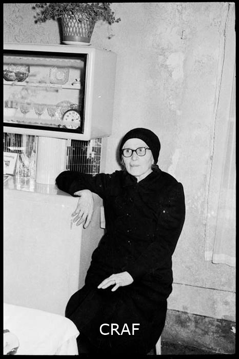 Ritratto di un' anziana seduta su una sedia ed appoggiata ad una credenza di...