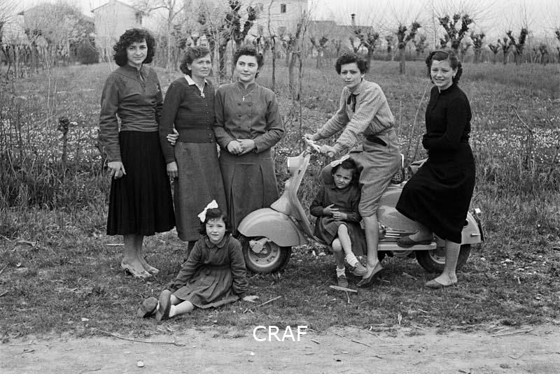 Ritratto di un gruppo di ragazze e due bambine accanto e sedute su di una Vespa...