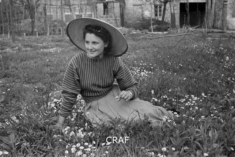 Ritratto di Elena Gobat seduta in un prato primaverile ricolmo di margherite