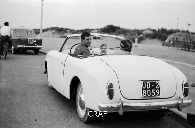 Ritratto della famiglia Giacomello all'interno della loro auto decappottabile...