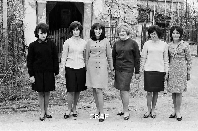 Ritratto di un gruppo di ragazze tutte vestite a festa nel cortile di un...