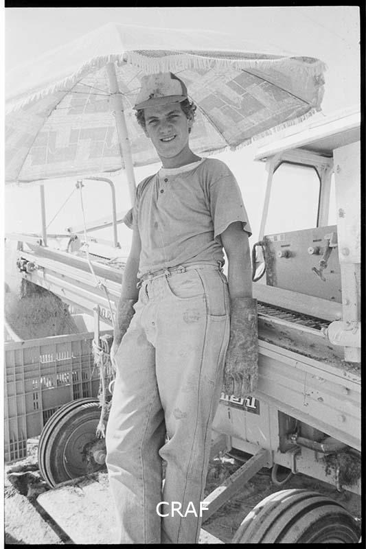 Ritratto di un giovane contadino in posa accanto a un mezzo agricolo. Un...