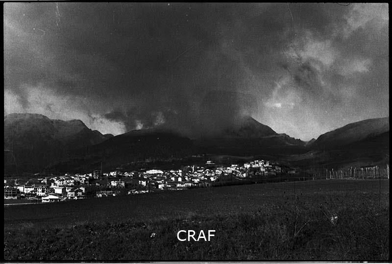 Veduta di un paese non identificato alle pendici delle montagne in Abruzzo. La...