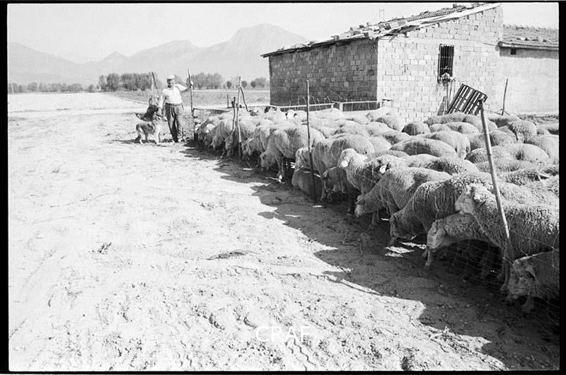 Un pastore assieme al suo cane davanti a un piccolo recinto dove è rinchiuso un...