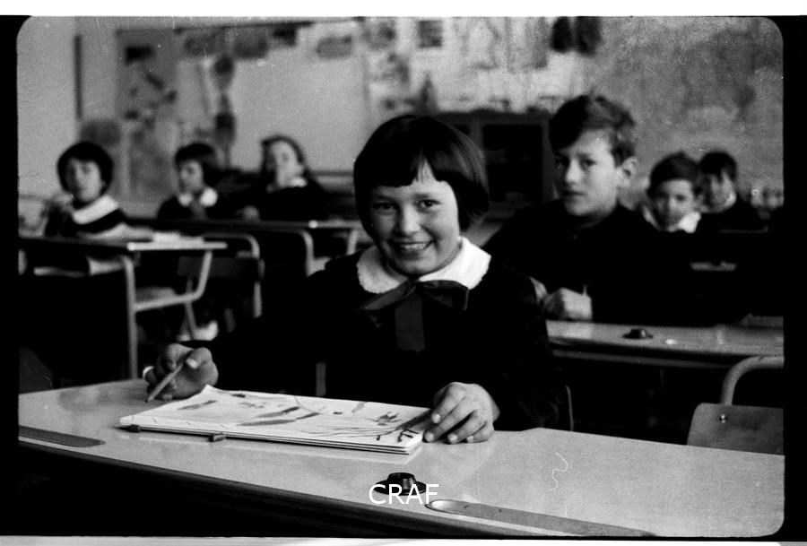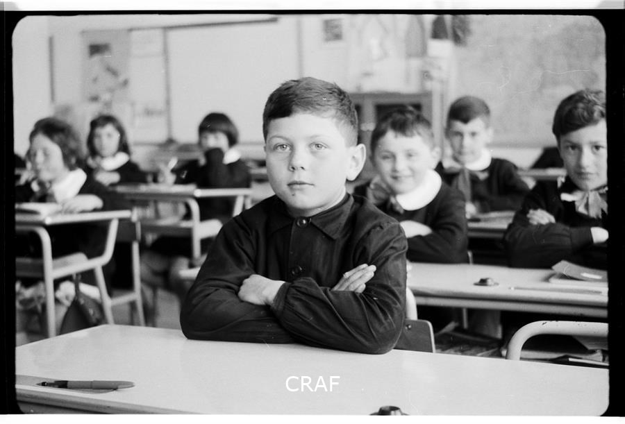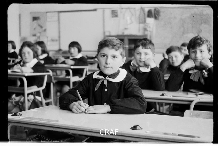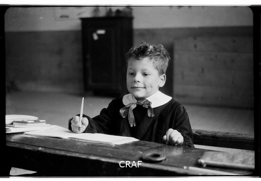Ritratto dello studente Valter Centis seduto al banco di scuola mentre scrive...