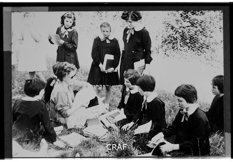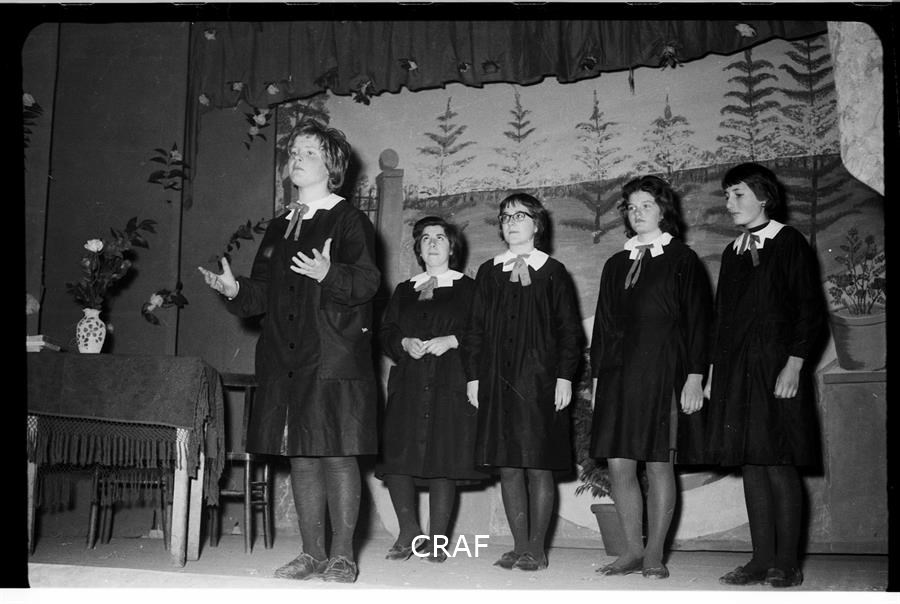 Ritratto di un gruppo di alunne durante una recita scolastica; vengono...