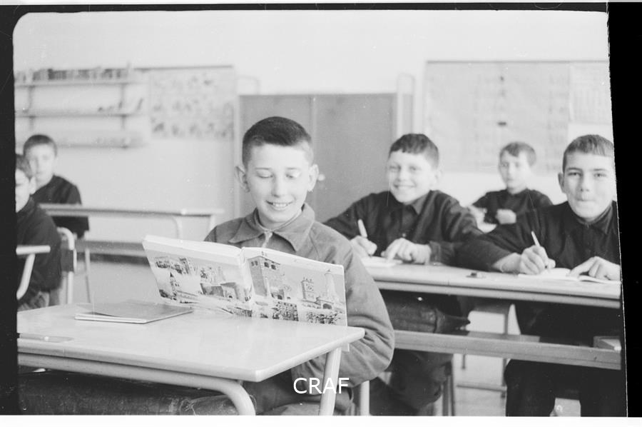 Ritratto di alcuni studenti seduti fra i banchi di scuola; si identificano:...