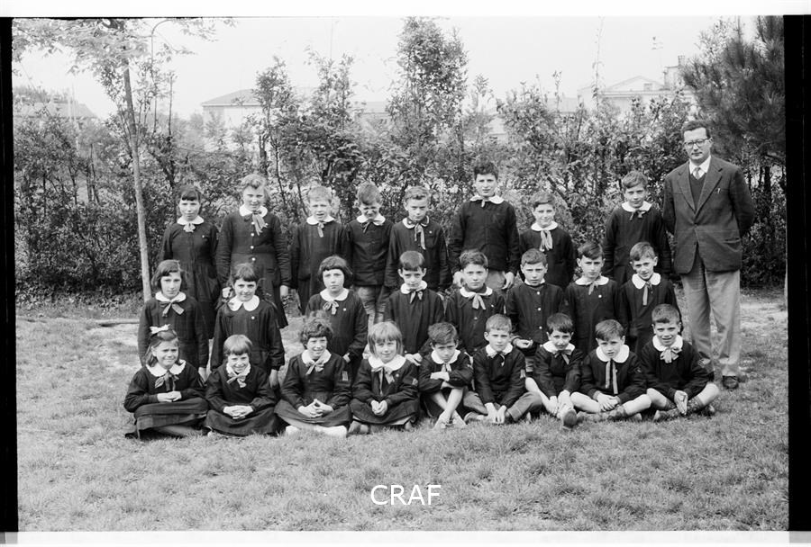 Ritratto di un gruppo di bambini e bambine assieme al maestro Giacomo Zannier...