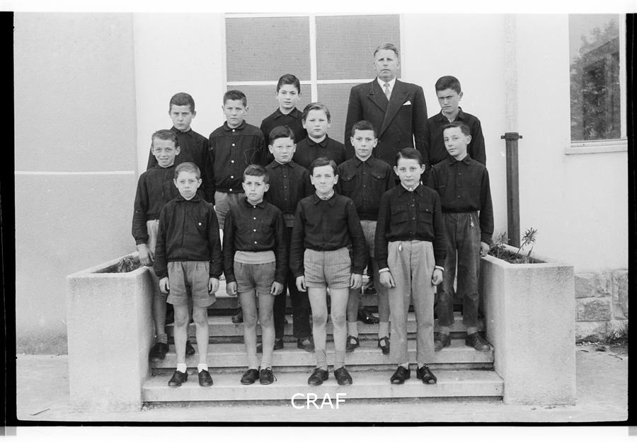 Ritratto di un gruppo di bambini assieme al maestro Centis nella scuola di...