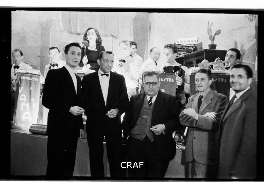 Ritratto di un gruppo di uomini dinanzi ad un palcoscenico dove si sta esibendo...