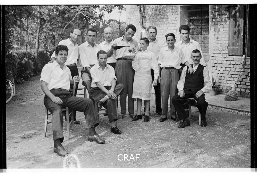 Ritratto di un gruppo di uomini nel cortile di un'abitazione; un bambino,...