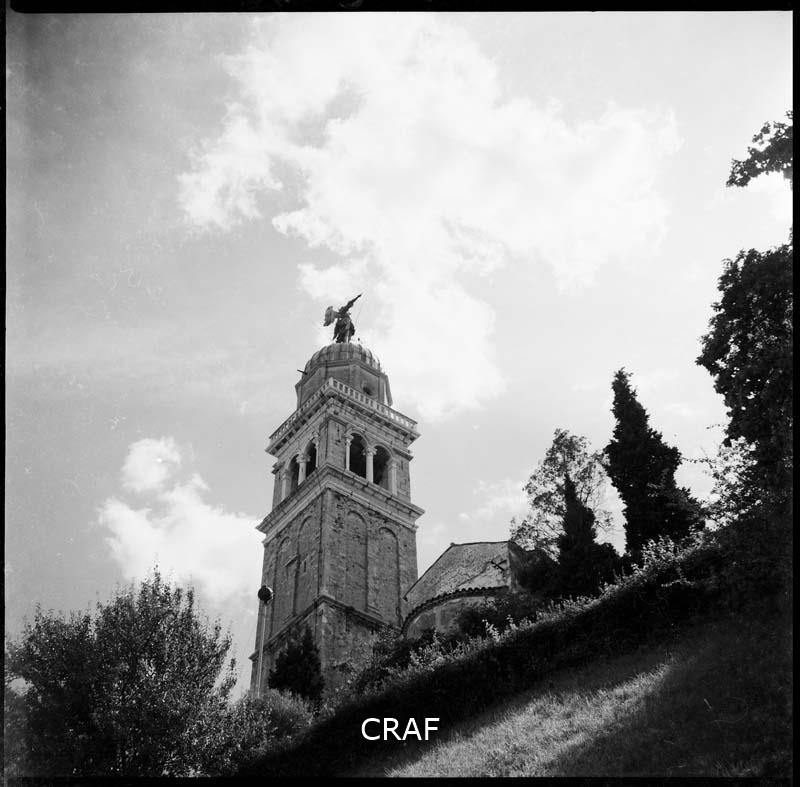 Scorcio del campanile del 1500, dell'angelo e dell'abside della chiesa di Santa...