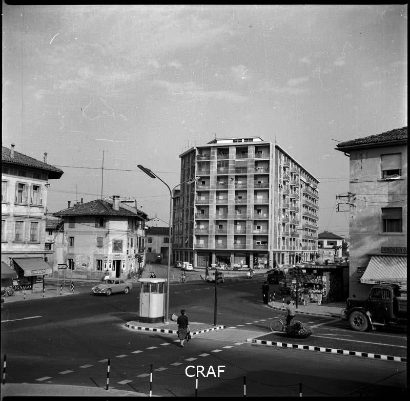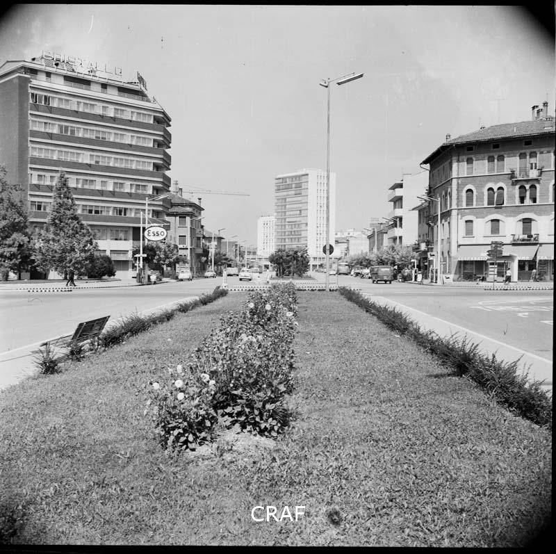 La città in movimento nell'attuale piazzale XXVI Luglio, ripreso da viale...