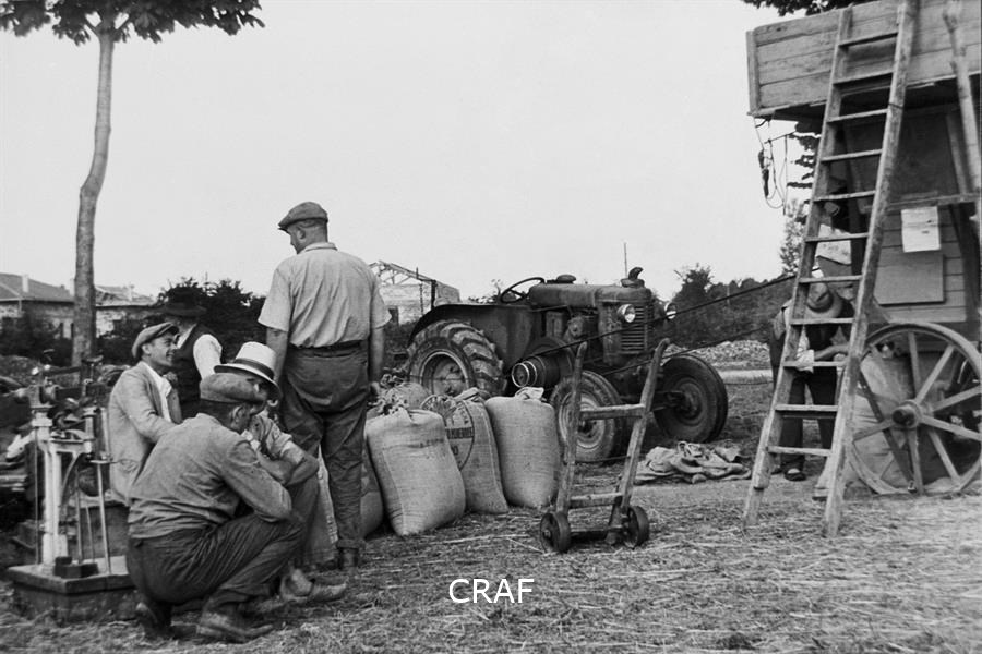 Immagine che ritrae un gruppo di persone alle prese con la trebbiatura di...