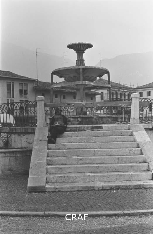 Ritratto di un uomo che dorme sulle scale della fontana comunale di Piazza Italia a Maniago