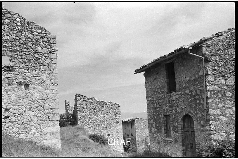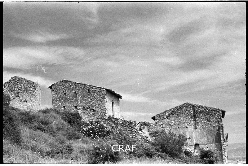 Veduta di un nucleo di edifici rurali in pietra su un terreno in pendenza. La...