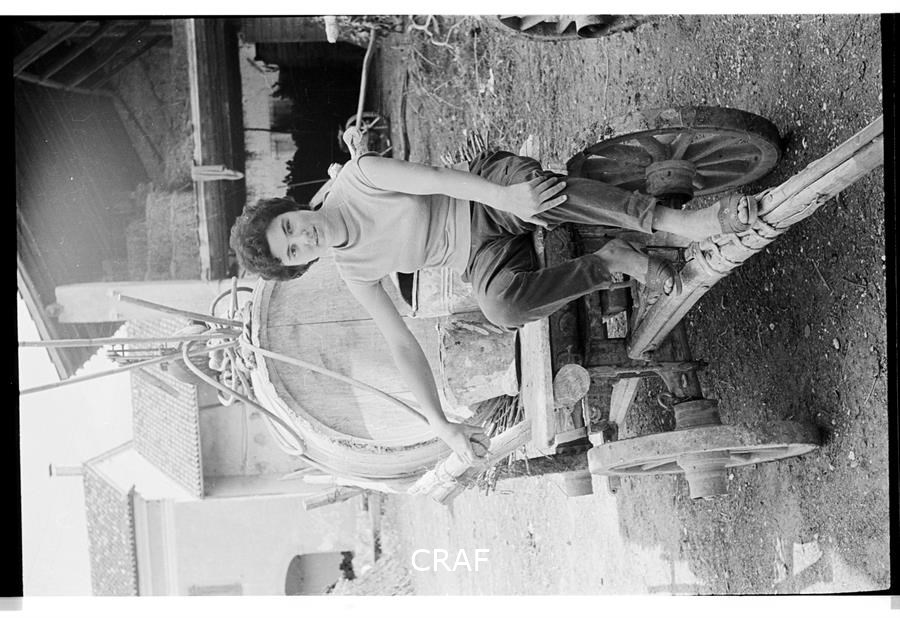Ritratto di Maria Quarin seduta su di un carretto di legno che trasporta una...