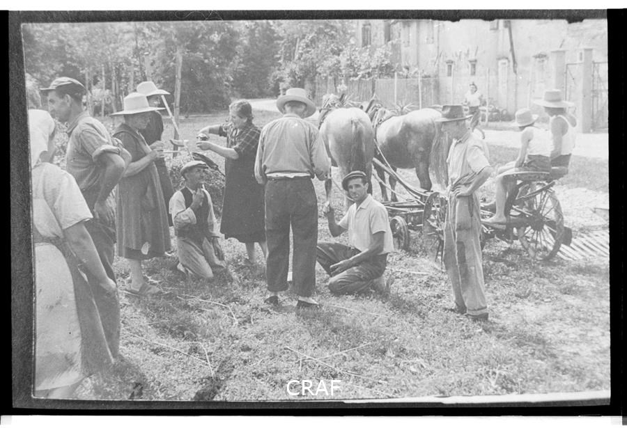 Ritratto di un gruppo lavoratori in un momento conviviale durante la mietitura