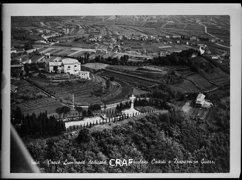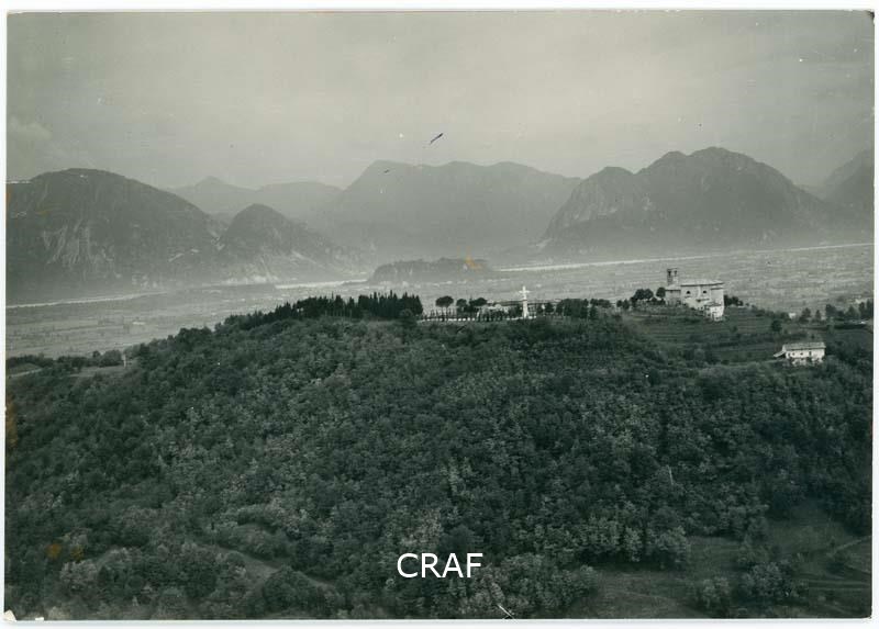 Panorama aereo del Monte di Buja con il Monumento ai Caduti e la croce luminosa...