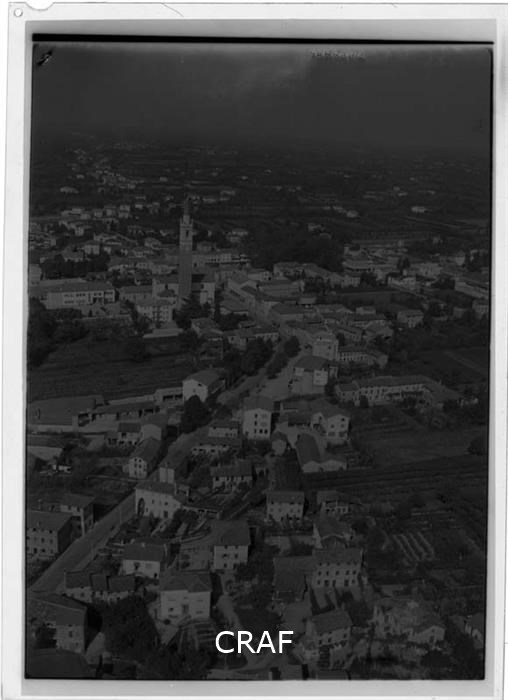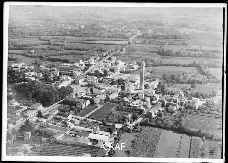 Riproduzione di un panorama aereo del centro di Azzano con al centro il...