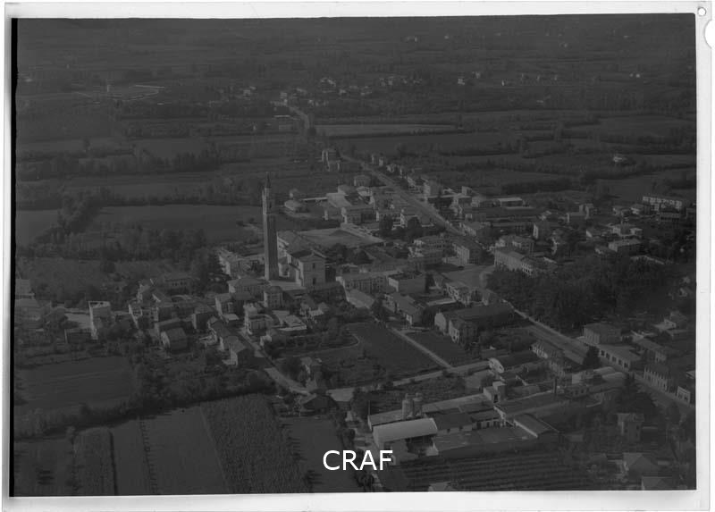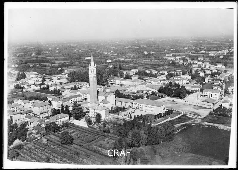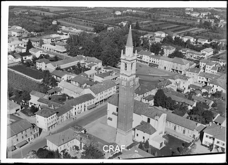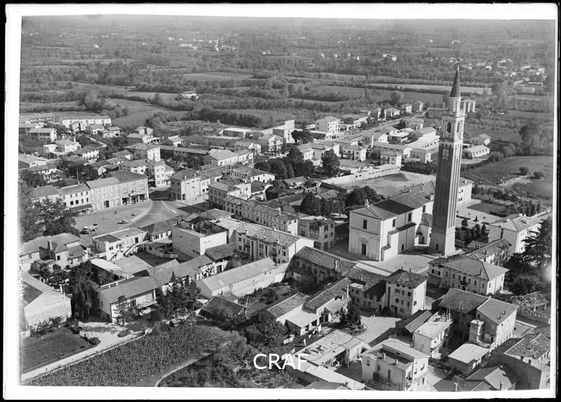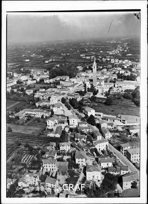 Riproduzione di un panorama aereo del centro di Azzano, con in primo piano il...